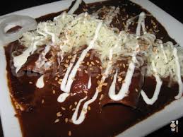 3.- Agrégales el pollo deshebrado y enróllalas. Báñalas con un poco más de mole.